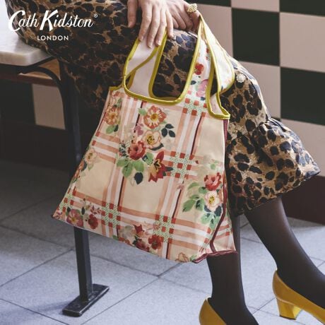たっぷりとしたマチのあるショッパーです。開閉がスムーズなスナップボタンと、便利な内ポケット付きで、機能とデザインを兼ね備えています。大胆なボタニカル柄と、コーラル&グリーンの伝統的なチェック柄を美しくミックスしたプリントです。