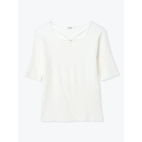 [型番:26550732637]フロントクロスのデザインがさりげない抜け感を演出するトップス。凹凸のあるリブ素材を使用しており、伸縮性に優れた着心地を実現します。すっきりとしたコンパクトなシルエットがポイント。パンツやスカートなど、様々なボトムスと相性の良いアイテムです。