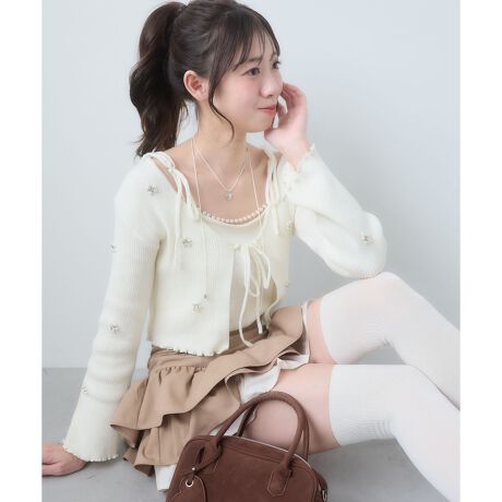 パールとビジューで作ったフラワーモチーフを散りばめた華やかカーディガンと、取り外しができるパールチェーン付きキャミニットのセットアイテム。