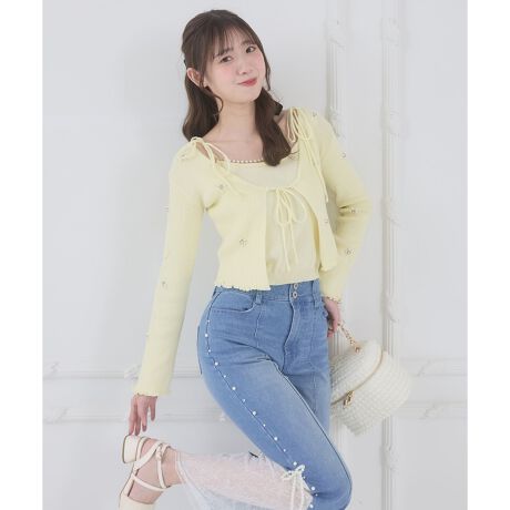 パールとビジューで作ったフラワーモチーフを散りばめた華やかカーディガンと、取り外しができるパールチェーン付きキャミニットのセットアイテム。