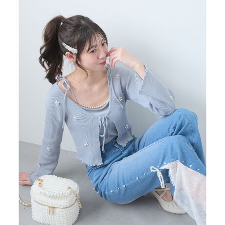 パールとビジューで作ったフラワーモチーフを散りばめた華やかカーディガンと、取り外しができるパールチェーン付きキャミニットのセットアイテム。