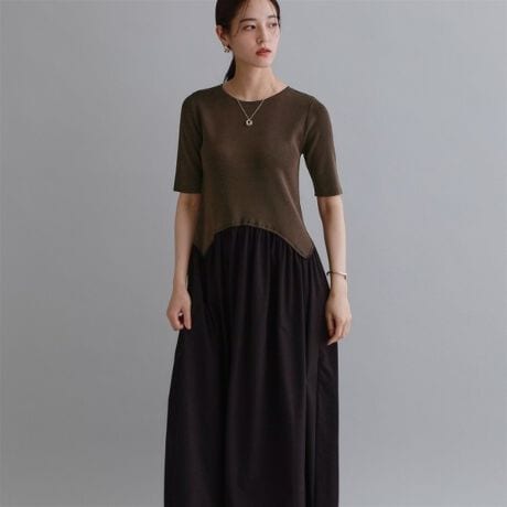 イレギュラーヘムの切り替えがモード感のあるドッキングニットワンピース