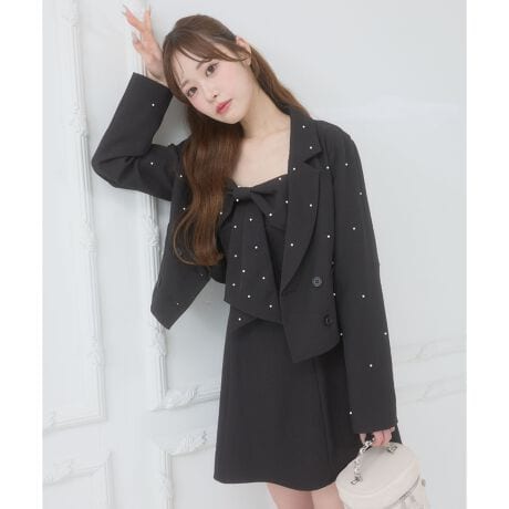 ラインストーンやパールを散りばめた、華やかなショート丈ジャケット。