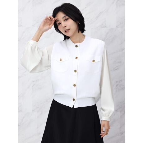 フロントポケットと金色ボタンがアクセントになったニットベスト。