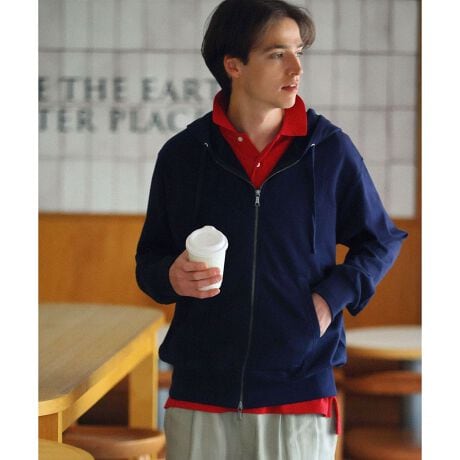 近年トレンドアイテムとしても注目されているアメカジの定番アイテム、ジップアップフーディー。耐久性に優れ、なめらかな肌触りが特徴のアメリカ産スーピマコットンを使用し、長く愛用できるシンプルなデザインに仕上げました。ブルゾンやブレザーの中に重ねても窮屈さを感じにくい、程よい厚みもこだわりのポイントです。