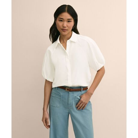 バブルスリーブが目を引く、エレガントでクリーンなブラウス