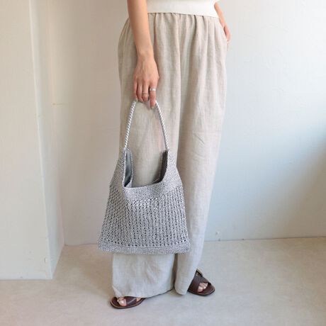 ・メタリックコードを編み込んだ、シンプルながら存在感のある柄編みバッグ