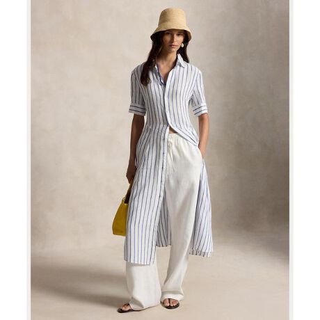 糸染めのストライプをあしらった上質なリネン素材を使用したシャツドレス。ウエストのシェイプされたシームと流れるようなAラインスカートのパネル構造が特徴・Aラインのシルエット / ミッドカーフ丈・ポインテッドカラー / ボタン付き前立て / シェルボタン・肘丈の袖、ボタン付きバレルカフス・ウエストにサイドシームポケット・胸元にダーツ / ウエストにシェイプされたシーム / 前後にプリンセスライン / 背面中央にシーム / パネル構造 / 裏地なし・モデル身長178cm、着用サイズ4※注意:柄の配置は、商品によって異なります。 【素材】・本体:麻 100%【生産国】フィリピン