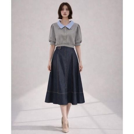 【美シルエットで差がつく、大人フェミニンなデニムフレアスカート】【Point】・ハイウエストデザインで腰位置を高く見せ、自然とスタイルアップが叶う一枚。・配色ステッチが縦ラインを強調し、すっきりとした印象に。・ベルトディテールがウエスト周りのアクセントになり、きちんと感もプラスします。・バックウエストはシャーリング仕様で、程よくフィットしながら快適な着心地です。・後ろファスナー付きで着脱もスムーズ◎ケア方法:手洗い可能透け感:なし裏地:なし伸縮性:あり光沢感:なし生地の厚さ:中肉