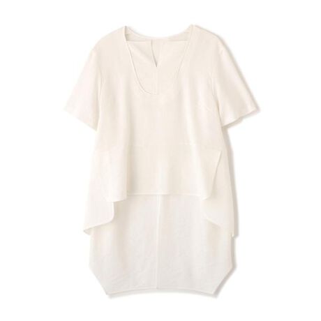 ボクシーなTブラウスで裾に切り替えがあり、後ろが長くなっていてヒップが隠れるデザインです。