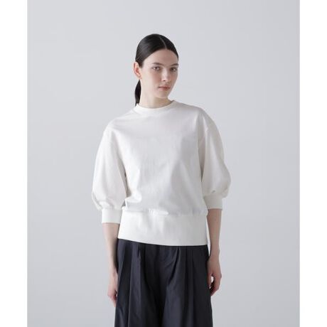 細番手の糸でハイゲージに編むことで、コンパクトに編み上げ、後加工でふくらみを持たせた、ハリ感がありながらも、ふくらみのある裏毛素材で仕立てました。