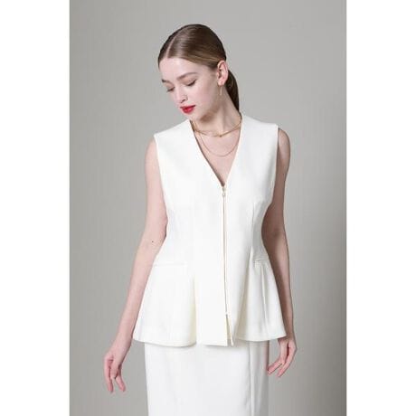 ウエストからふんわりと広がるシルエットが華やかで印象的なジレは、襟ぐりのVカットがスッキリとした印象を与え、ゴールドのジップが華やかなアクセントを添えています。デニムに合わせたカジュアルなスタイリングから、同素材のスカートと組み合わせた綺麗めなコーディネートまで、幅広く活用できるアイテムです。