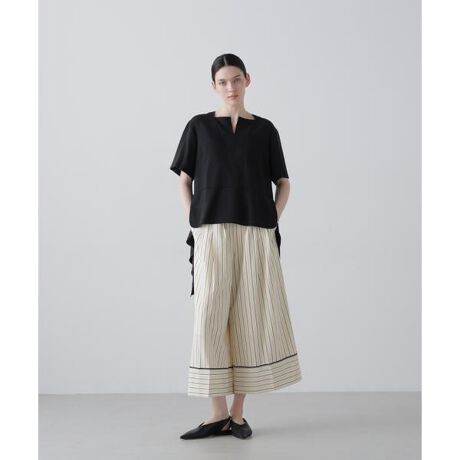 ウエストベルトや裾の切り替えに黒が入る事でリラックス感のあるストライプ柄を引き締めています。
