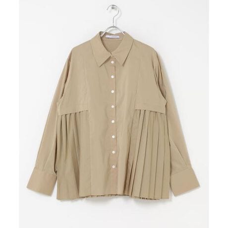 シャープな襟デザインに幅の異なるプリーツ素材をレイヤードした華やかなデザイン。後ろをメインにあしらったプリーツは前からもさりげなく覗き、立体感のあるシルエットを演出します。上品さと遊び心を兼ね備えた、大人のモードスタイルにぴったりの1枚。