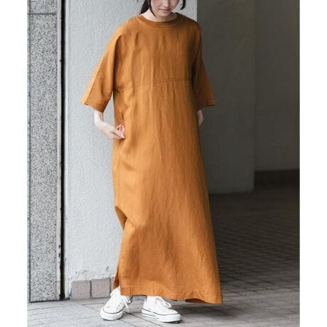 オンオフ兼用で着られる布帛素材を使用しており、リネン特有の節とセルロースの落ち感を活かした風合いが、シンプルながらも雰囲気のあるナチュラルな印象を与えつつ、カジュアルにも活躍する見た目が完成。
