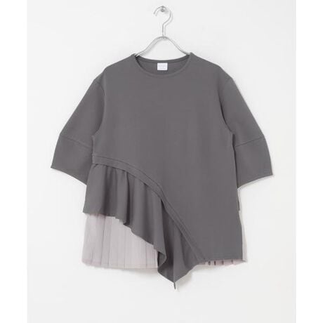 裾にかけて斜めに切り替えを入れフレアとプリーツをドッキングしたデザインTシャツ。2種類の素材を使用していることで立体感をプラスし、動くたびに表情が出て1枚で着映えする主役アイテムに。さらっと快適な接触冷感、汗染み防止、UVカットの機能素材を使用し暑い季節にも快適な着心地を実現します。