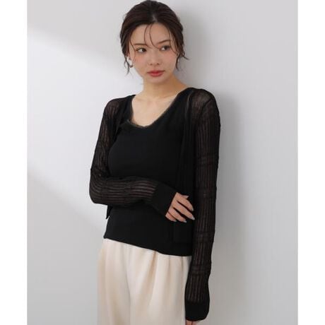 透かし編みが軽やかな印象のシアー素材のカーディガン。変わり織デザインでシンプルになりすぎず、フェミニンな表情をプラスします。ショート丈でワンピースやスカートはもちろん、パンツスタイルとも好バランス。羽織るだけでコーディネートを軽やかに見せてくれます。