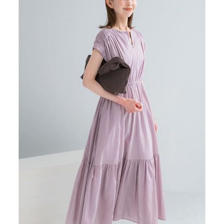 柔らかなコットンボイル素材を使用した、夏にぴったりのエアリーなワンピース。程よい透け感があり、一枚でさらりと着るだけで軽やかな印象に仕上がります。肩部分の細やかなタックとギャザーが自然なボリュームを出し、ウエストのリボンを絞ればメリハリのあるシルエットを楽しめます。ラベンダーや華やかなブルー、トレンド感のあるブラウンやブラックの4色展開で、シーンや気分に合わせて選べる一枚です。
