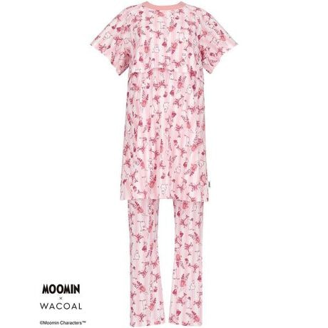 【マタニティ用パジャマ(産前・産後兼用)】トップス袖丈:半袖(3分袖)・ボトム脇丈:長ズボン(10分丈)・かぶりタイプ・授乳あき付き【MOOMIN×WACOAL】●好奇心旺盛なムーミン一家と仲間たちが描かれたマタニティ用パジャマ●ストライプ模様の上に散らばる植物とムーミンたち。春夏の季節にぴったりなさわやかな印象のプリント●マタニティの体型変化を考慮したリラックスシーンにぴったりのパターン設計で、産前も産後も快適に着用できる●ボトムはマタニティ用の設計でおなかをすっぽり包みこみ、ウエストも高伸度ゴムの使用でラクなはきごこち(ウエストゴム取り替え口あり)●伸びやかで、シーズンを通して着られるパジャマの定番素材である綿100%スムース素材を本体に使用。60番手の細い糸で編まれる生地は、肌ざわりがなめらかで上品な風合い(60綿スムース素材)●ボトムにポケットあり※お洗濯は、必ず「取扱い表示」にしたがってください。