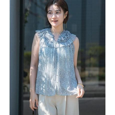 首元にティアードギャザーをあしらい、華やかさと抜け感を兼ね備えたフラワープリントブラウス。カットジャガード素材に織り込まれたシルバー糸が、上品な印象を引き立てます。甘さを抑えたオリジナルの花柄は、ニュアンスのあるグレーや柔らかいイエロー、シックなネイビーで展開し、シーンを問わず取り入れやすい一枚に仕上げました。胸元から背中にかけてぐるりと施されたギャザーが、どの角度から見ても美しい立体感を演出。首元のリボンはあえて結ばず垂らすことで、こなれた表情に。スラックスでハンサムにまとめるのはもちろん、スカートやハーフパンツと合わせたリラックススタイルもおすすめです。