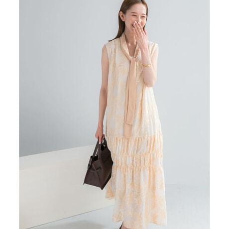 軽やかなジャガード素材で仕立てた、ボリュームシルエットが魅力のワンピース。落ち着いたトーンの柄に、ほんのり透けるシアー感を重ねることで上品な表情に仕上げました。裾に向かって切り替えを入れることで自然なボリュームを生み出し、甘くなりすぎず洗練された印象をキープ。分量のあるデザインながらも広がりすぎず、すっきりとしたシルエットを演出します。ふわりとした立体感が動くたびに美しく、1枚で存在感のある着こなしが完成。合わせる小物次第でデイリーから少し特別なシーンまで幅広く対応できる、着映え力の高い一枚です。