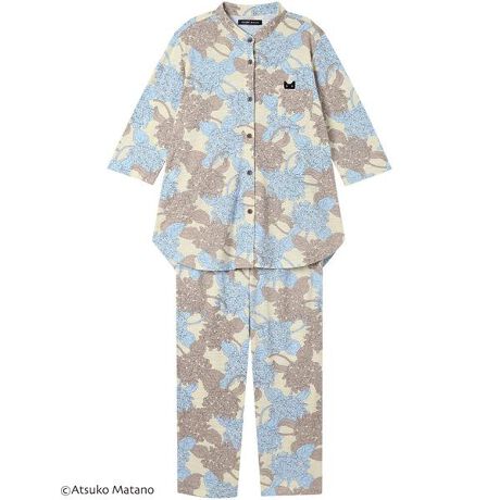 [型番:HDT224]・少しフシ(糸節)の見える生地感が特徴でやさしい肌ざわりの綿100%の天竺素材を使用・エレガントで控えめな華やかさの紫陽花柄のテキスタイル・胸ポケットから顔をのぞかせている黒猫のアップリケがデザインポイント※お洗濯は、必ず「取扱い表示」にしたがってください。