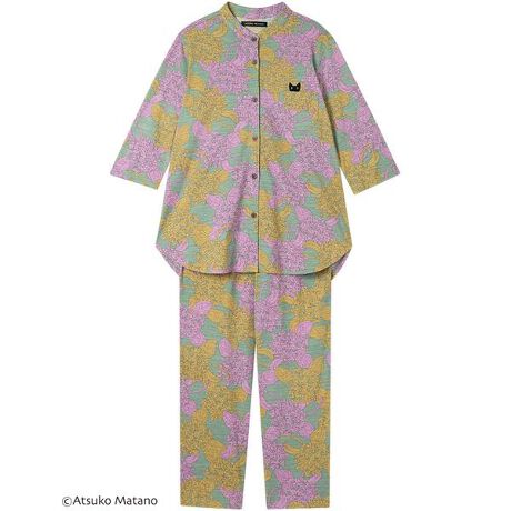 [型番:HDT224]・少しフシ(糸節)の見える生地感が特徴でやさしい肌ざわりの綿100%の天竺素材を使用・エレガントで控えめな華やかさの紫陽花柄のテキスタイル・胸ポケットから顔をのぞかせている黒猫のアップリケがデザインポイント※お洗濯は、必ず「取扱い表示」にしたがってください。