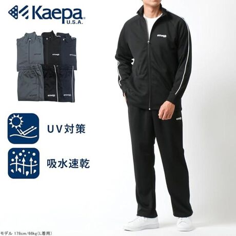 上下ともにKaepaのブランドロゴ刺繍、サイドにはスポーティなラインを施し、