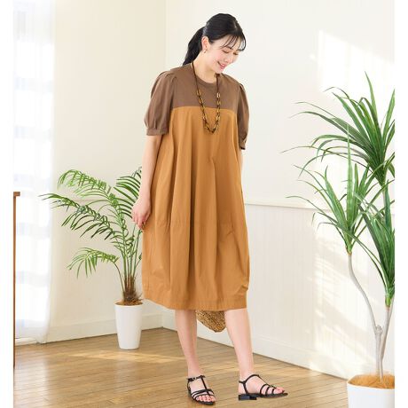身頃上部と袖は伸びのいい綿天竺、裾は薄手の布帛を使用した異素材使いのワンピース。