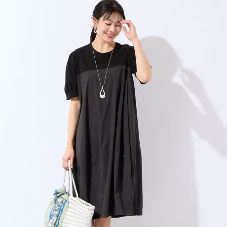 身頃上部と袖は伸びのいい綿天竺、裾は薄手の布帛を使用した異素材使いのワンピース。