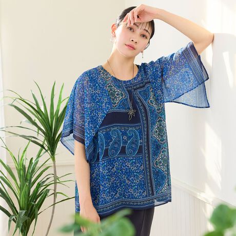 【洗える・3Lサイズあり】更紗柄ハンカチスリーブブラウス