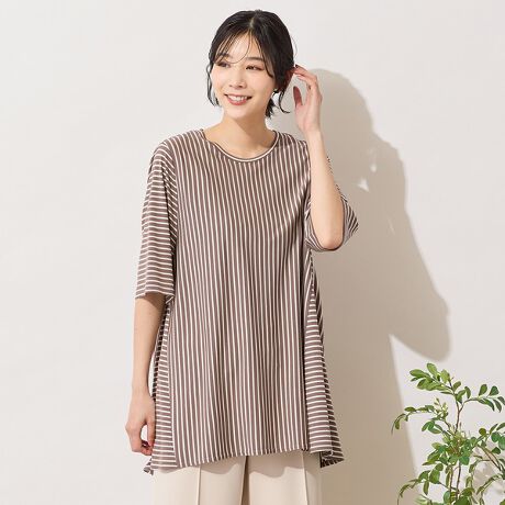 ストライプ使いの身頃ですっきり見えし、お出かけにも、おうち時間にもぴったりな1枚です。