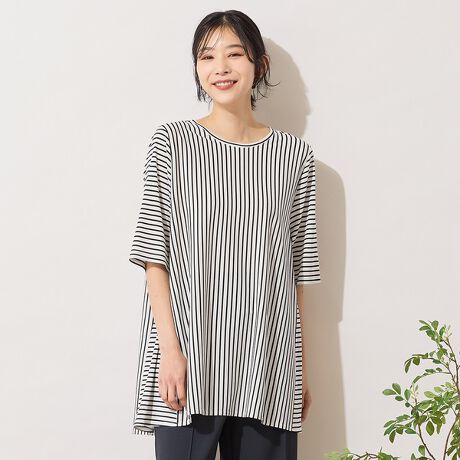 ストライプ使いの身頃ですっきり見えし、お出かけにも、おうち時間にもぴったりな1枚です。