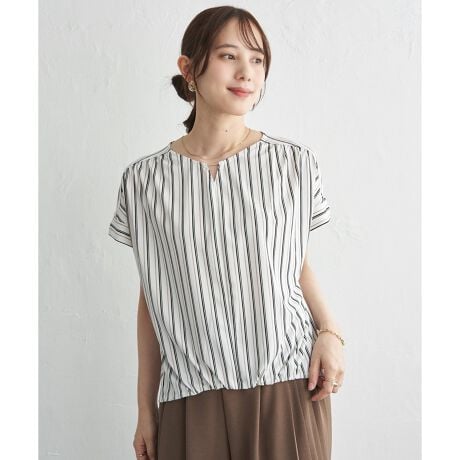 前裾に入れたギャザーが自然なタックイン風のシルエットをつくり、着るだけでバランスよくまとまります。