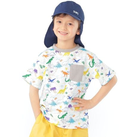 恐竜のプリントは線画タッチとハンコ風プリントを組み合わせた、動きのあるポップなデザインで元気なキッズにぴったり。