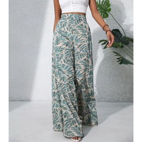 -南国リーフ柄が目を惹くボタニカルワイドパンツ。