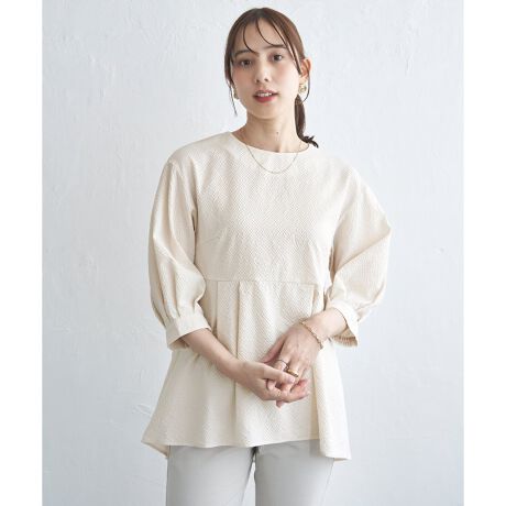 表面に凹凸のあるサッカー素材で、無地でも着映えするペプラムブラウス。