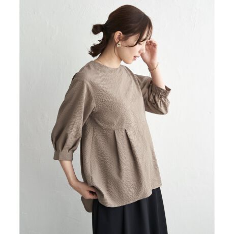 表面に凹凸のあるサッカー素材で、無地でも着映えするペプラムブラウス。