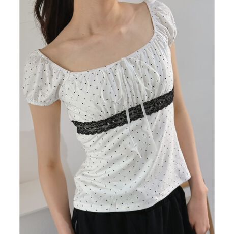 デコルテをきれいに見せるネックラインと、ふんわりとしたパフスリーブが女性らしいシルエットを演出します。