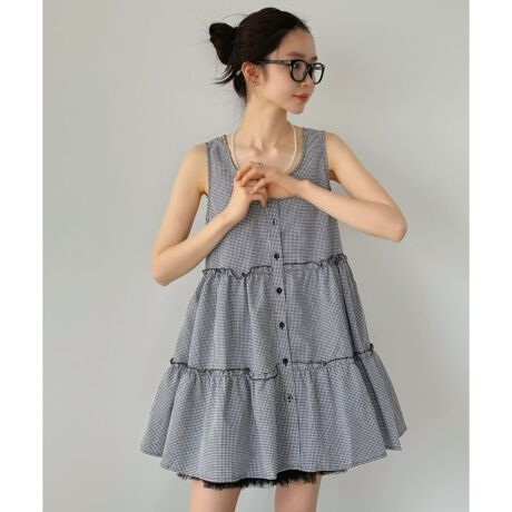 フロントボタン仕様で着脱しやすく、程よく広がるティアードシルエットが女性らしい印象に。