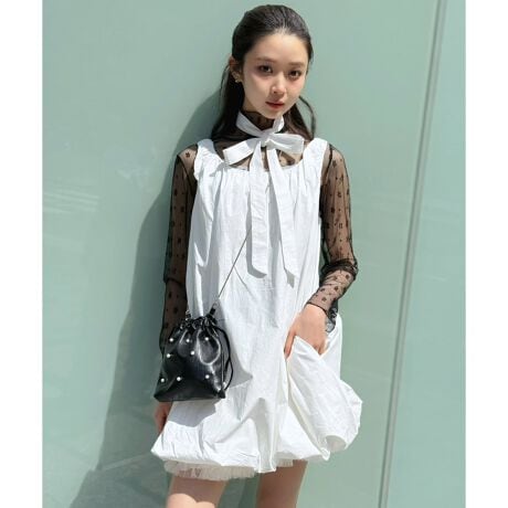 付属のロングリボンは首元に巻いたり、結び方をアレンジしてコーディネートのアクセントに。