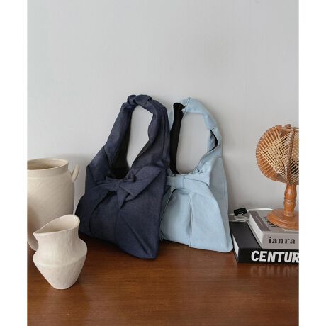 フロントの結びデザインがアクセントになったデニムトートバッグ。