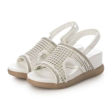 エレガントな装いにふさわしい「HIROKO KOSHINO FEMME」のウェッジサンダル。アッパーに施された繊細なレーザーカット加工が涼やかな透け感を、光を受けて輝くラインストーンが上品な華やぎを足元に添えます。見た目の美しさだけでなく、返りの良いウェッジインソールを採用することで抜群の屈曲性を実現。足の動きにしなやかに寄り添うため、6cmヒールという高さがありながらも歩行時の負担を軽減し、長時間のお出かけでも疲れにくい設計です。ウェッジソール特有の広い接地面がしっかりとした安定感を提供し、自然なスタイルアップを叶えます。贅沢なディテールと快適な履き心地が調和した、大人の夏を彩るプレミアムな一足です。