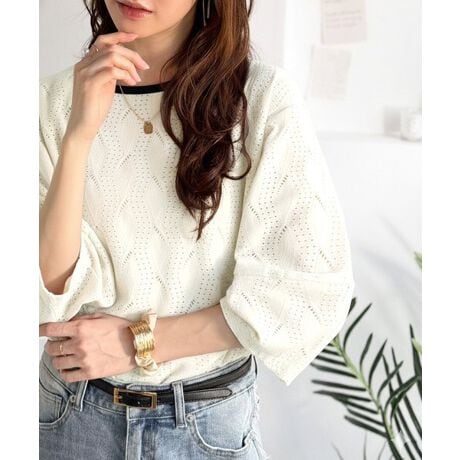 絶妙な透け感のウェーブ柄ジャガードが、品のある大人カジュアルを演出。