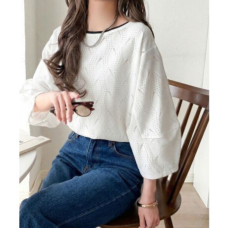 絶妙な透け感のウェーブ柄ジャガードが、品のある大人カジュアルを演出。