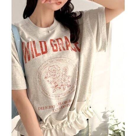 【mily bilet】甘辛バランスが叶う!綿100%ゆるシルエット裾ドロストフリルプリントTシャツ