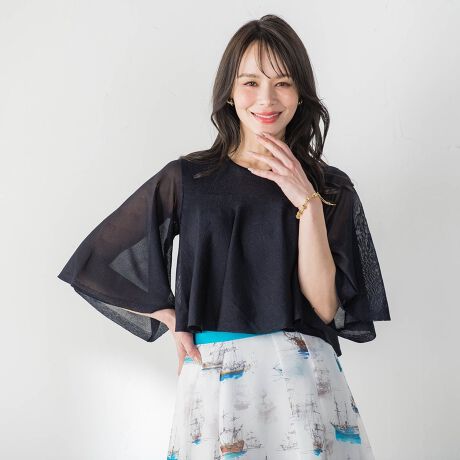 長めの袖もフレアーにし、バストのラッフルと合わせてより華やかな印象です。