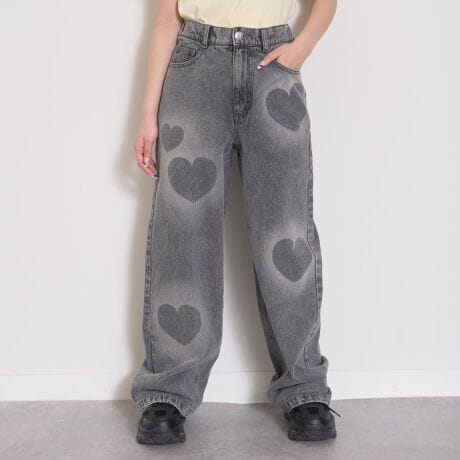 ハートモチーフのスプレーデザインがかわいいデニムパンツです。スタイル盛れするストレートのワイドシルエット! いつものスタイリングをワンランク上にしたい子におすすめのアイテムです◎。ウエストの後ろには、アジャスターつきの調節ゴムを入れました。ハンカチなどの持ち運びに便利なポケットがついているのもうれしいポイントです。【おすすめの着用時期は春夏シーズン】