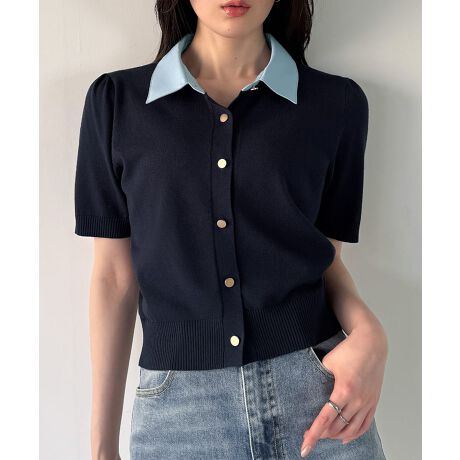 リボン取り外し可能ショート丈ドッキング半袖ポロニット