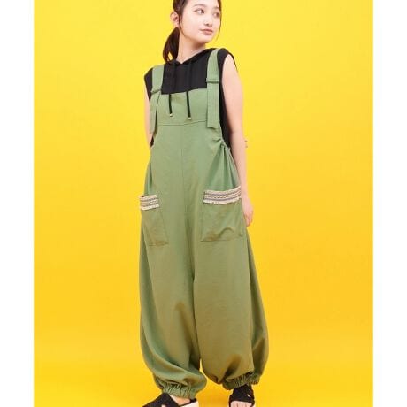 裾のギャザーで、ぽってりとした程よいボリューム感を演出したサルエル風サロペット。